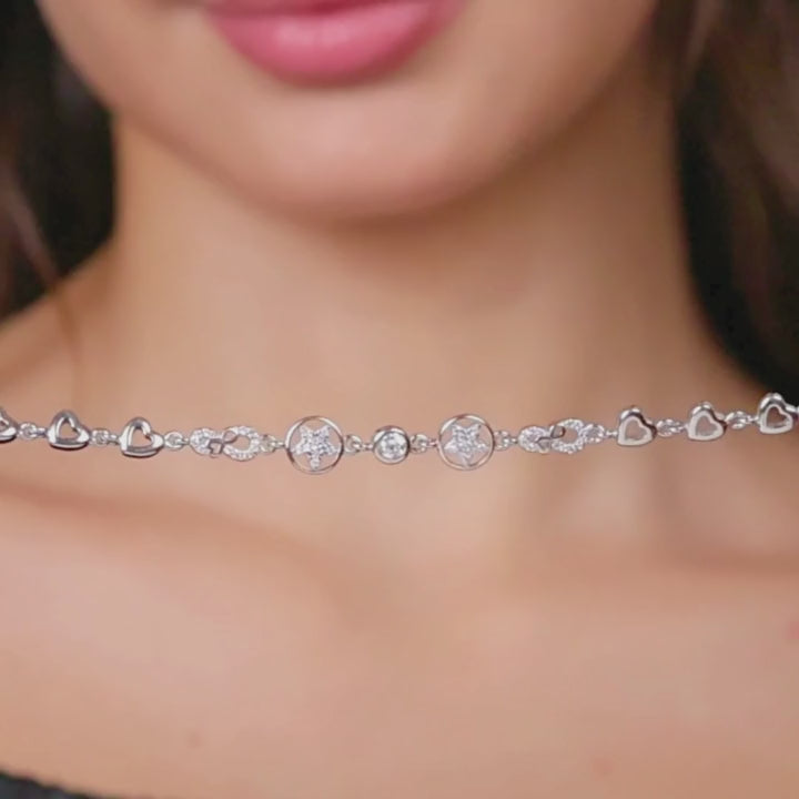 Dive into summer style with this whimsical silver bracelet featuring an enchanting mix of open hearts, lucky horseshoes, and sparkling cubic zirconia star and circle motifs. Its playful yet elegant design captures the essence of beachside charm.