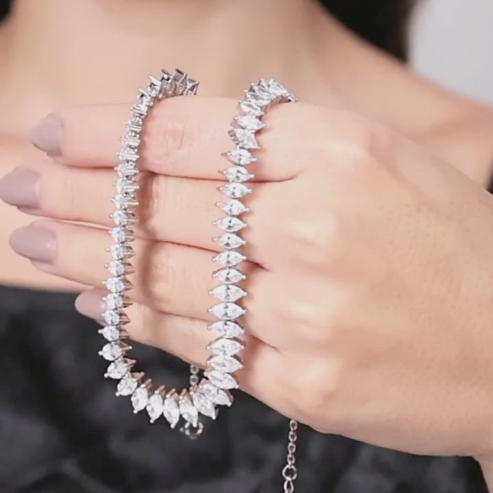 Illuminate your look with this brilliant necklace and earring set, featuring a continuous cascade of sparkling marquise-cut stones. Its elegant design gracefully enhances your neckline, perfect for sophisticated evenings or adding a touch of glamour to any attire.
