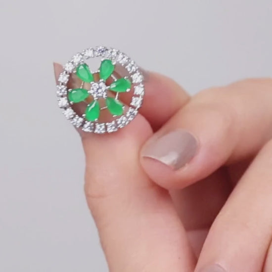 These striking circular stud earrings feature a brilliant central clear stone, surrounded by a captivating arrangement of pear-shaped emerald green stones and a sparkling halo of clear accents, forming a vibrant floral design.