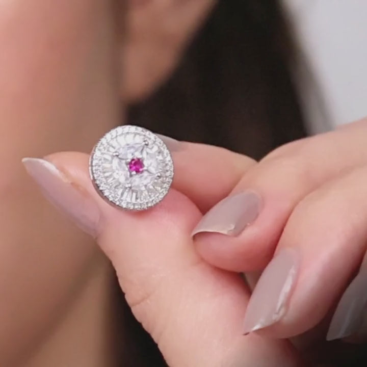 These exquisite silver stud earrings showcase a vibrant ruby red gemstone at their core, surrounded by an intricate pattern of marquise-cut and pave-set clear stones. The striking design offers both classic elegance and captivating sparkle.