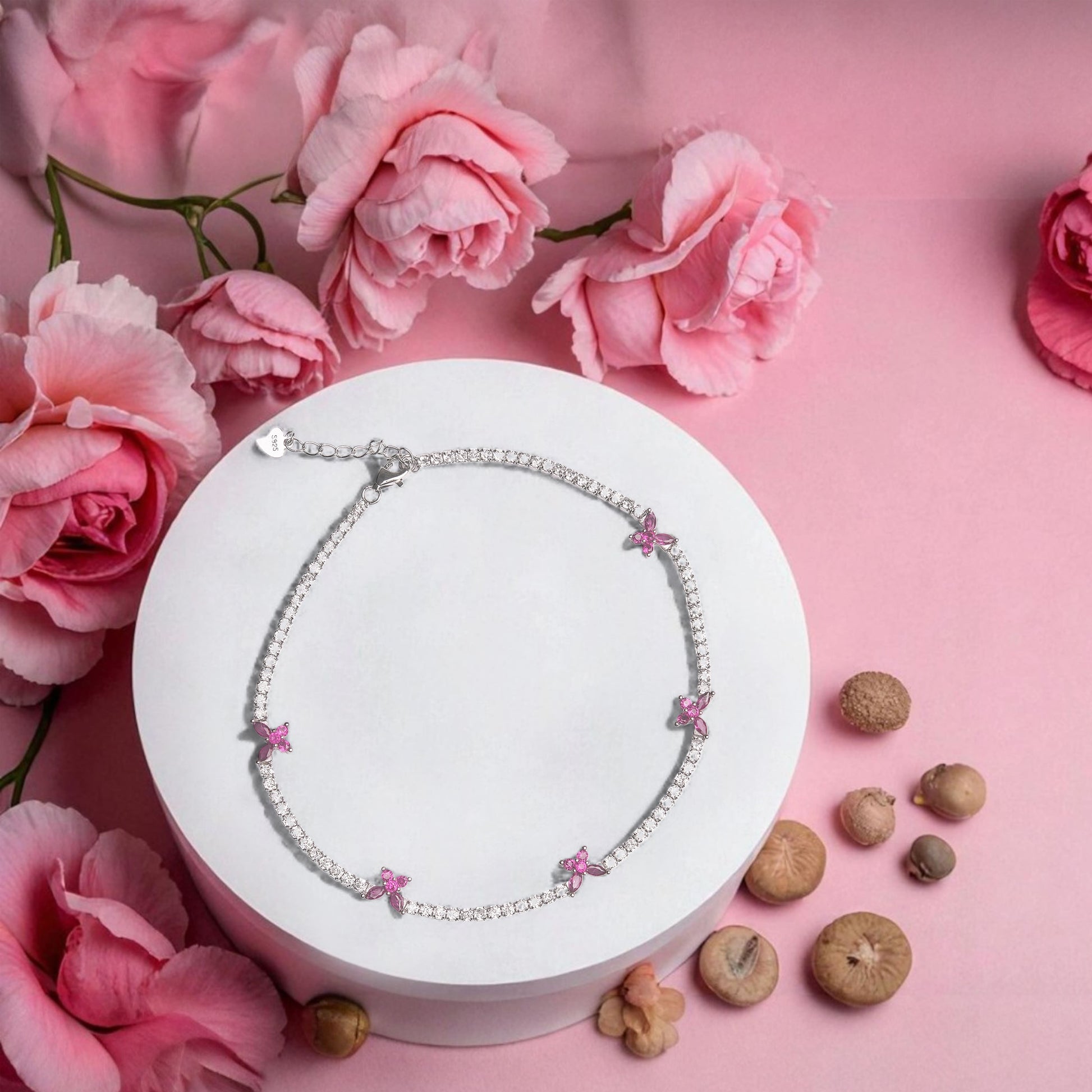 This charming sterling silver payal features a sparkling line of pav̩ stones with delicate pink butterfly accents. It's a whimsical and elegant accessory, perfect for a touch of feminine grace. |