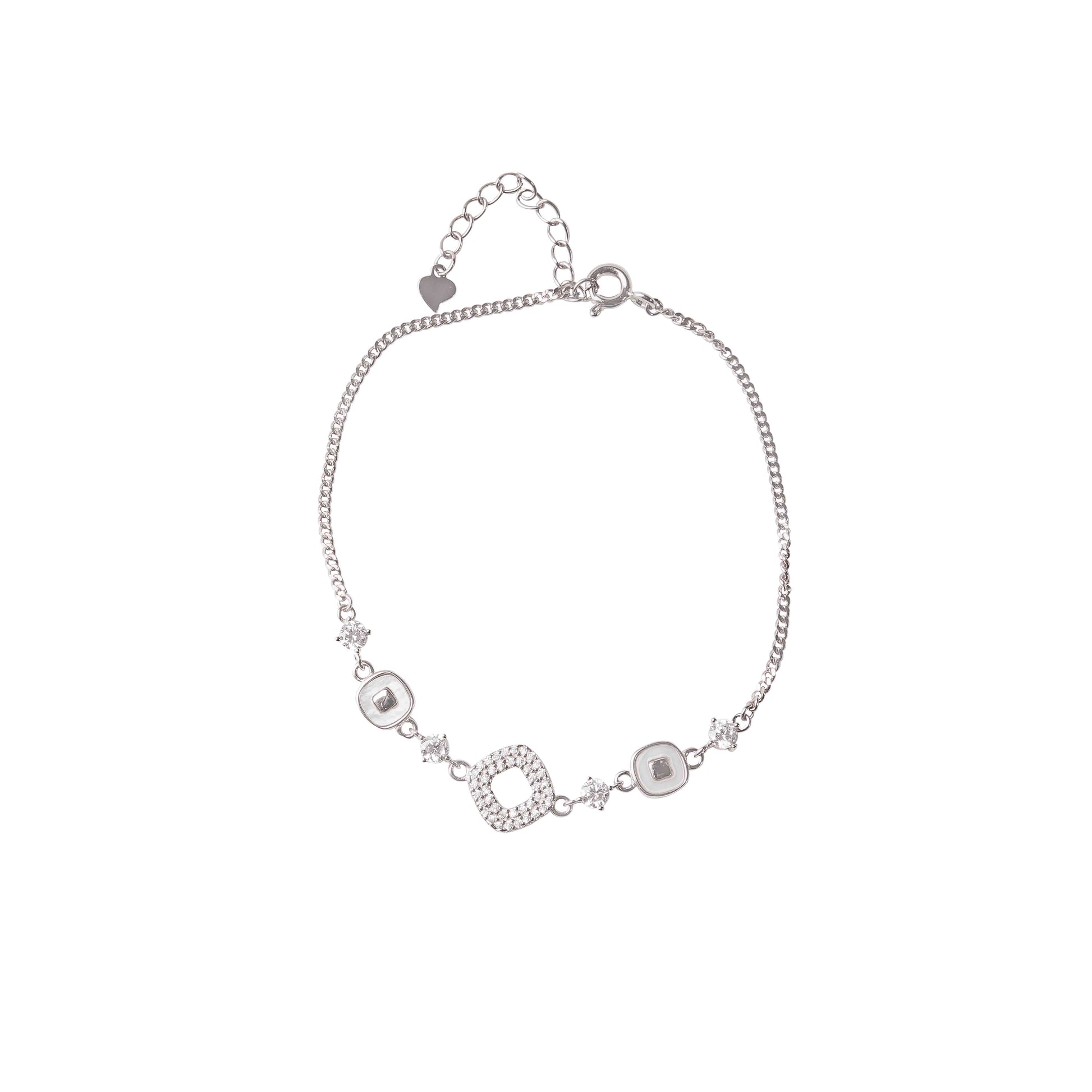 This sterling silver bracelet features a captivating design with a central cubic zirconia-paved square and sparkling round accents. It's a delicate and modern piece with celestial elegance.