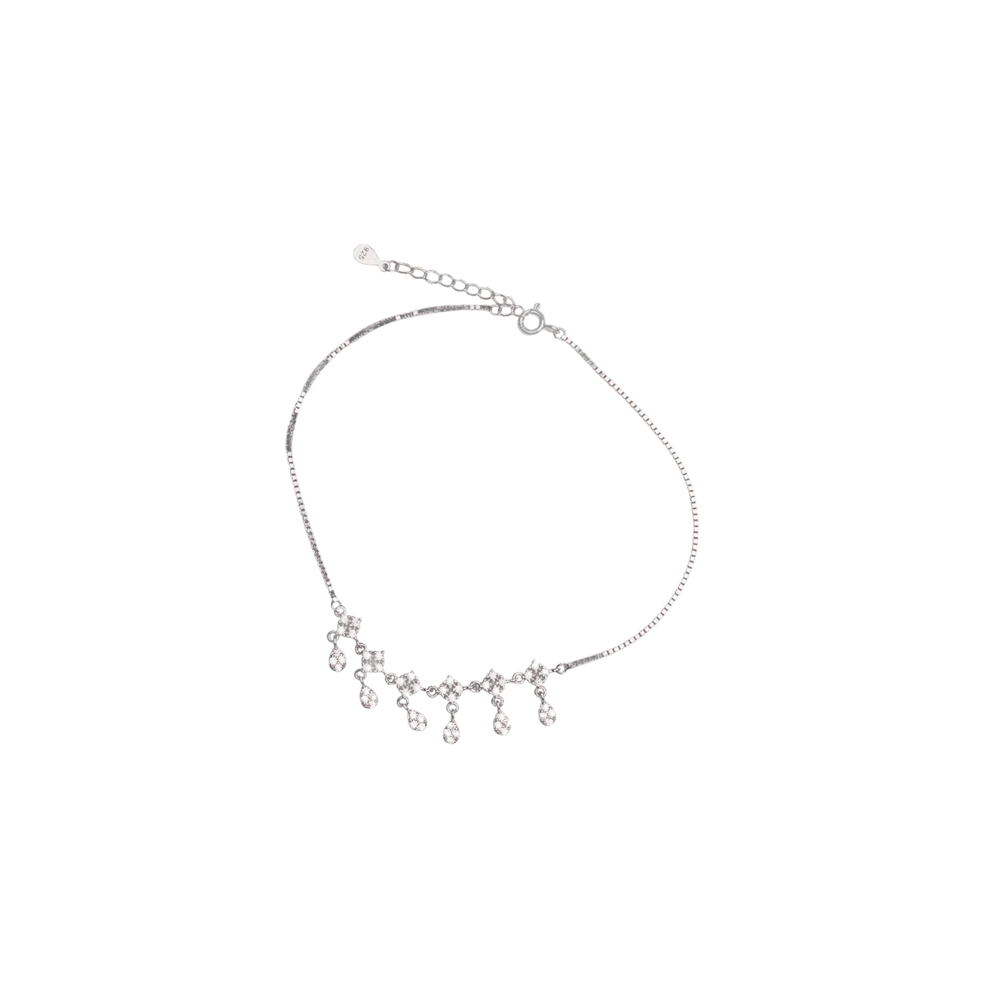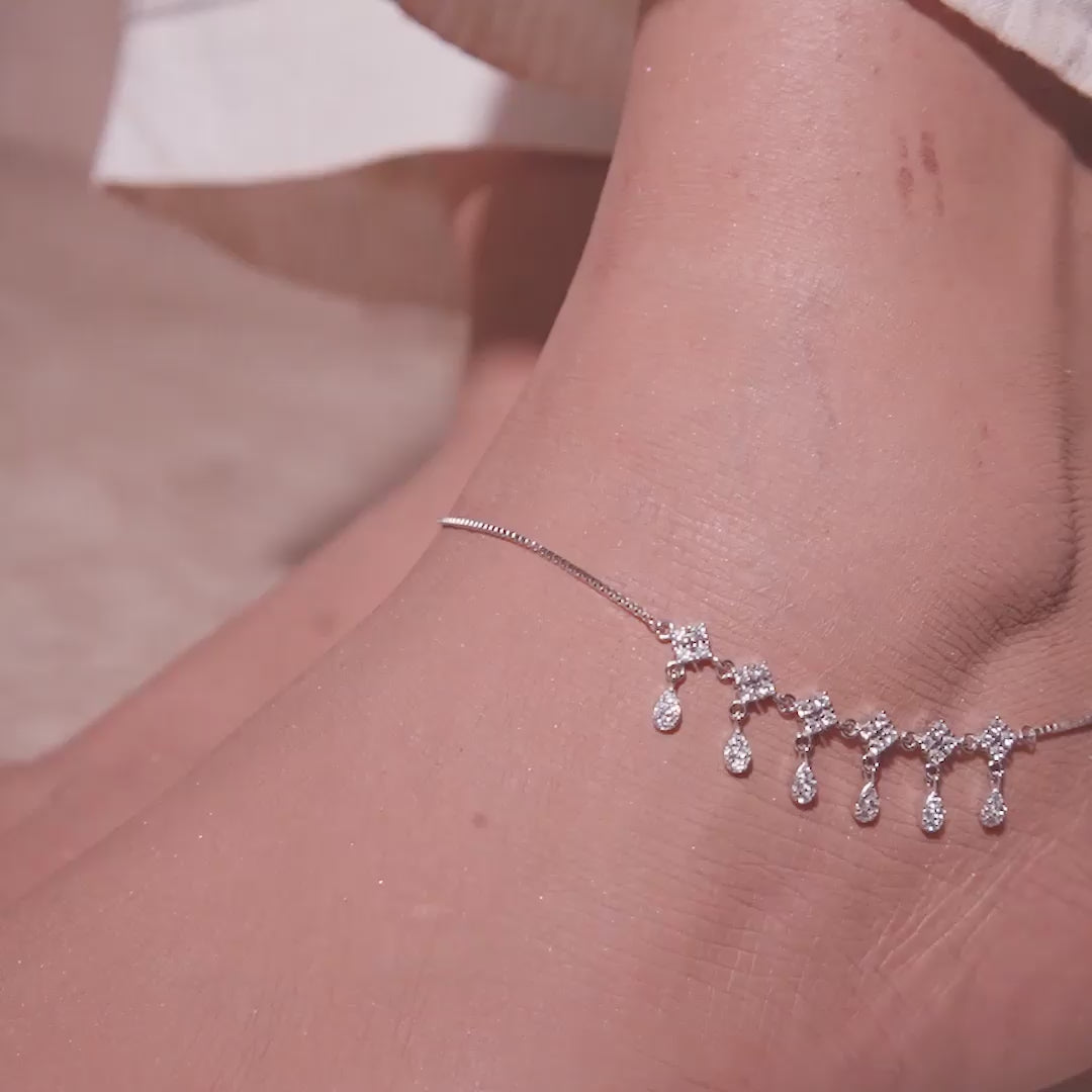 This delicate sterling silver payal features a single strand of tiny stones with elegant floral drops dangling below. It adds a touch of whimsical sparkle to every step. |
