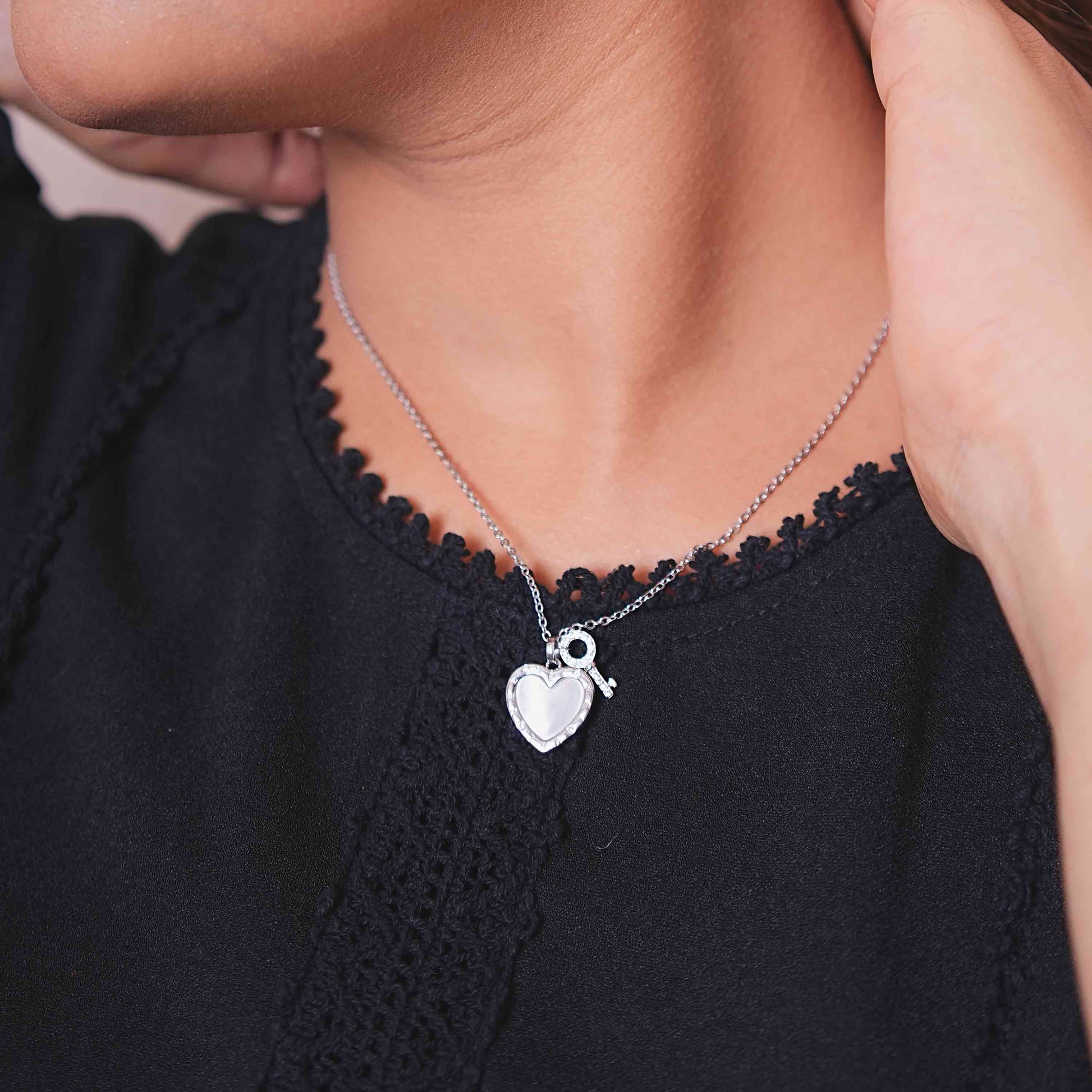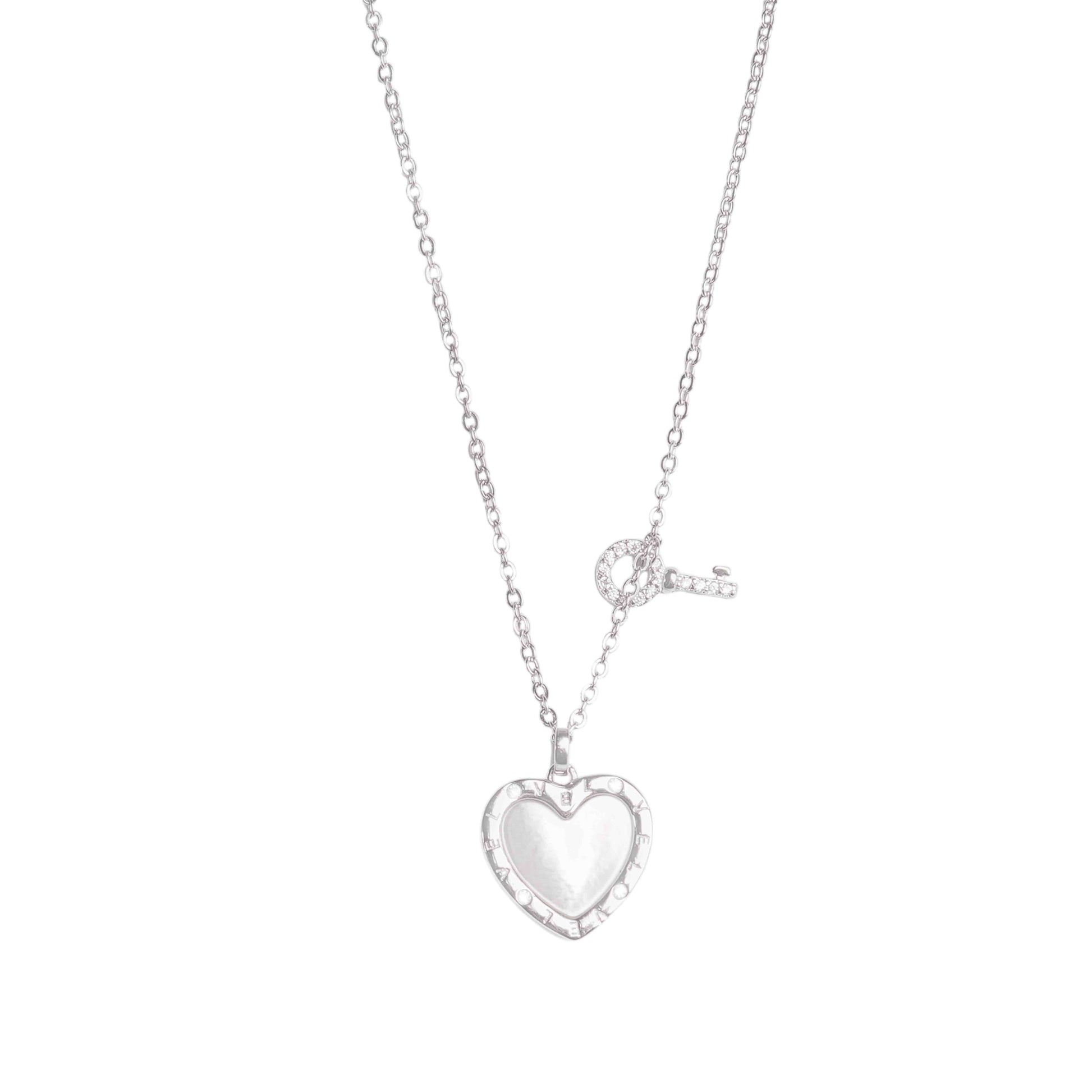 A charming sterling silver locket necklace featuring a mother-of-pearl heart and a tiny cubic zirconia-studded key, symbolizing a bond and cherished secret.