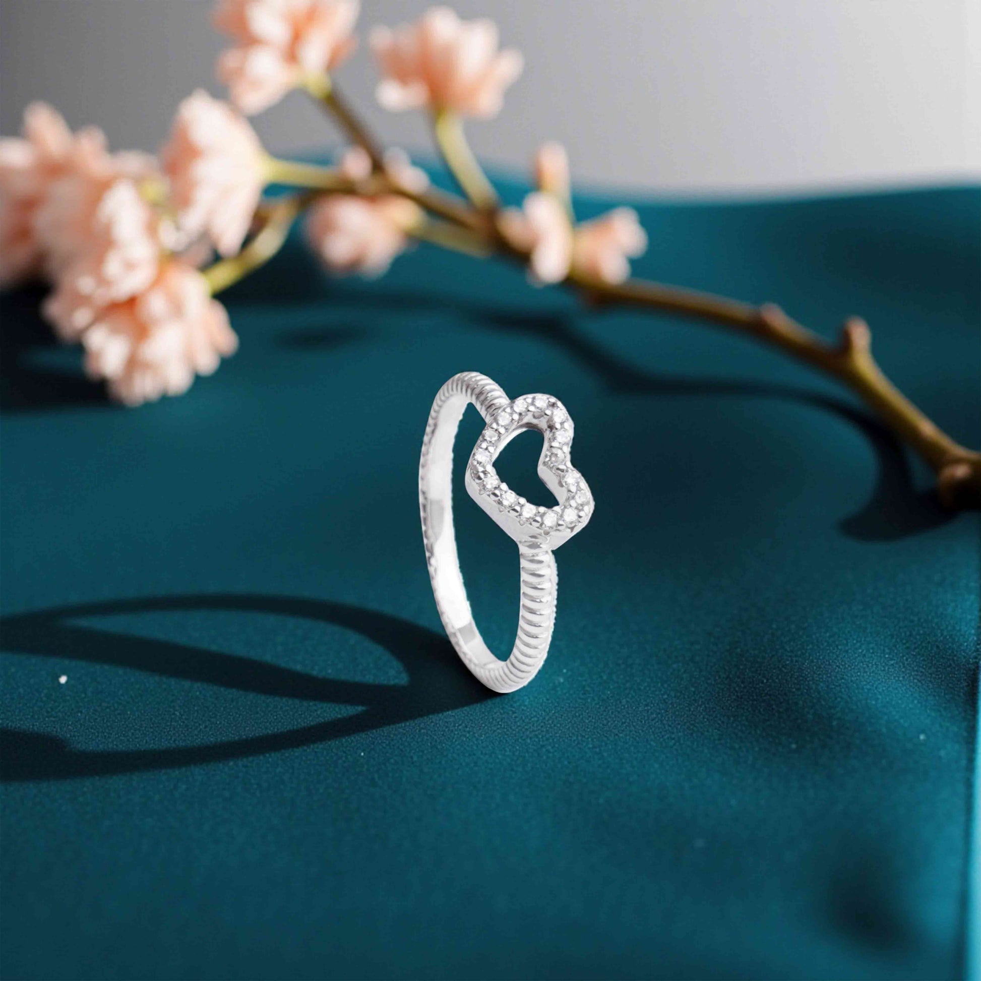 | A delicate, open-heart design adorned with brilliant pav̩ stones, set on a unique ribbed band. This charming ring is a sweet and timeless symbol of affection. |