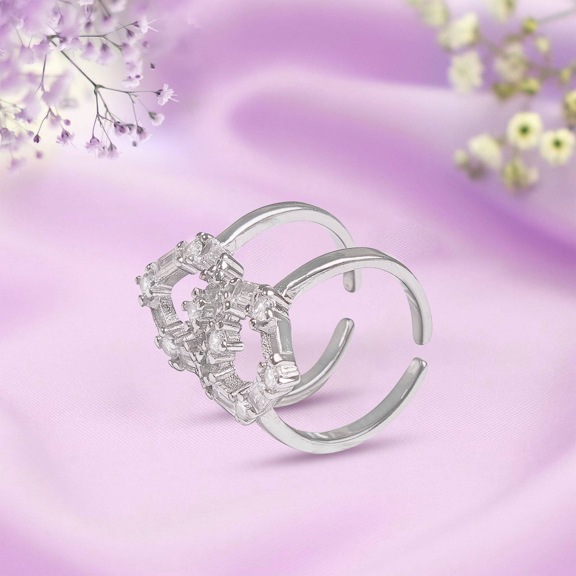 These adjustable toe rings are crafted from sterling silver and feature a unique interlocking design of two open hearts, each encrusted with dazzling cubic zirconia. |