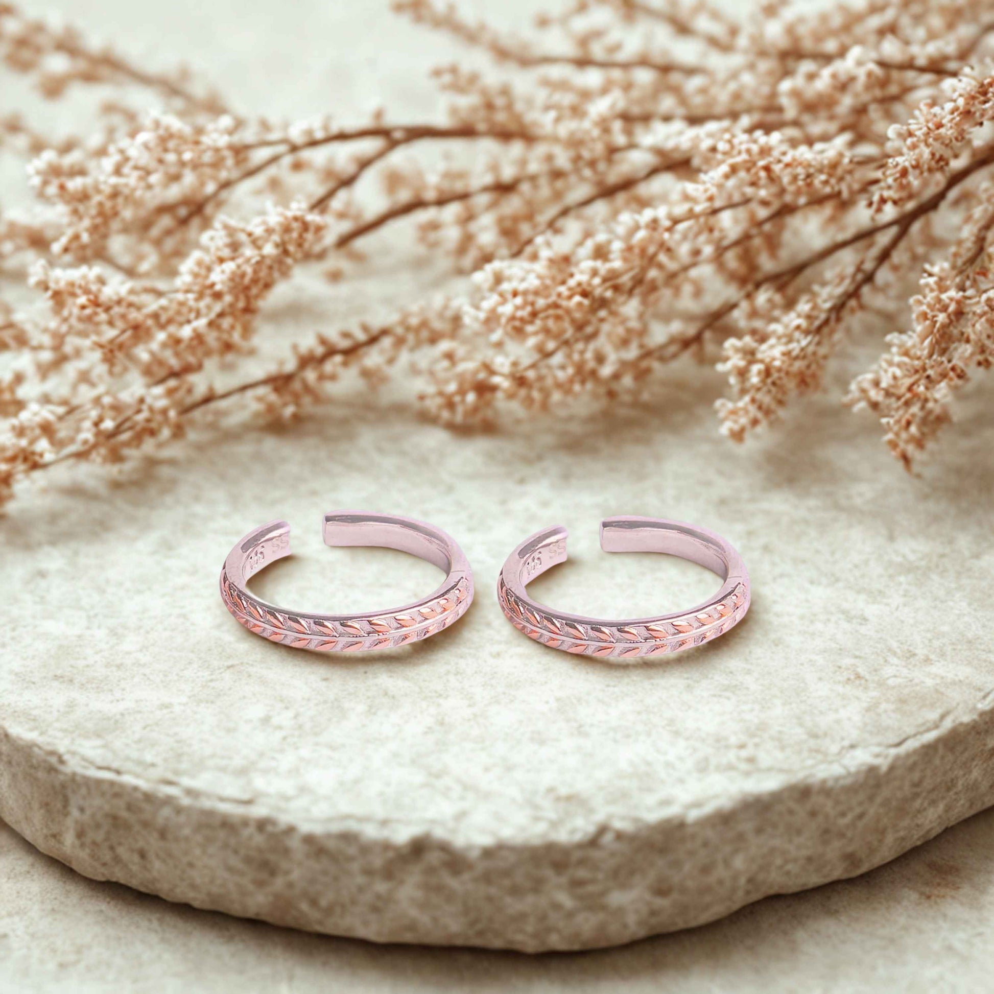 | These adjustable toe rings are crafted from sterling silver with a beautiful rose gold leaf pattern etched into the band, adding a subtle touch of color and nature-inspired elegance. |