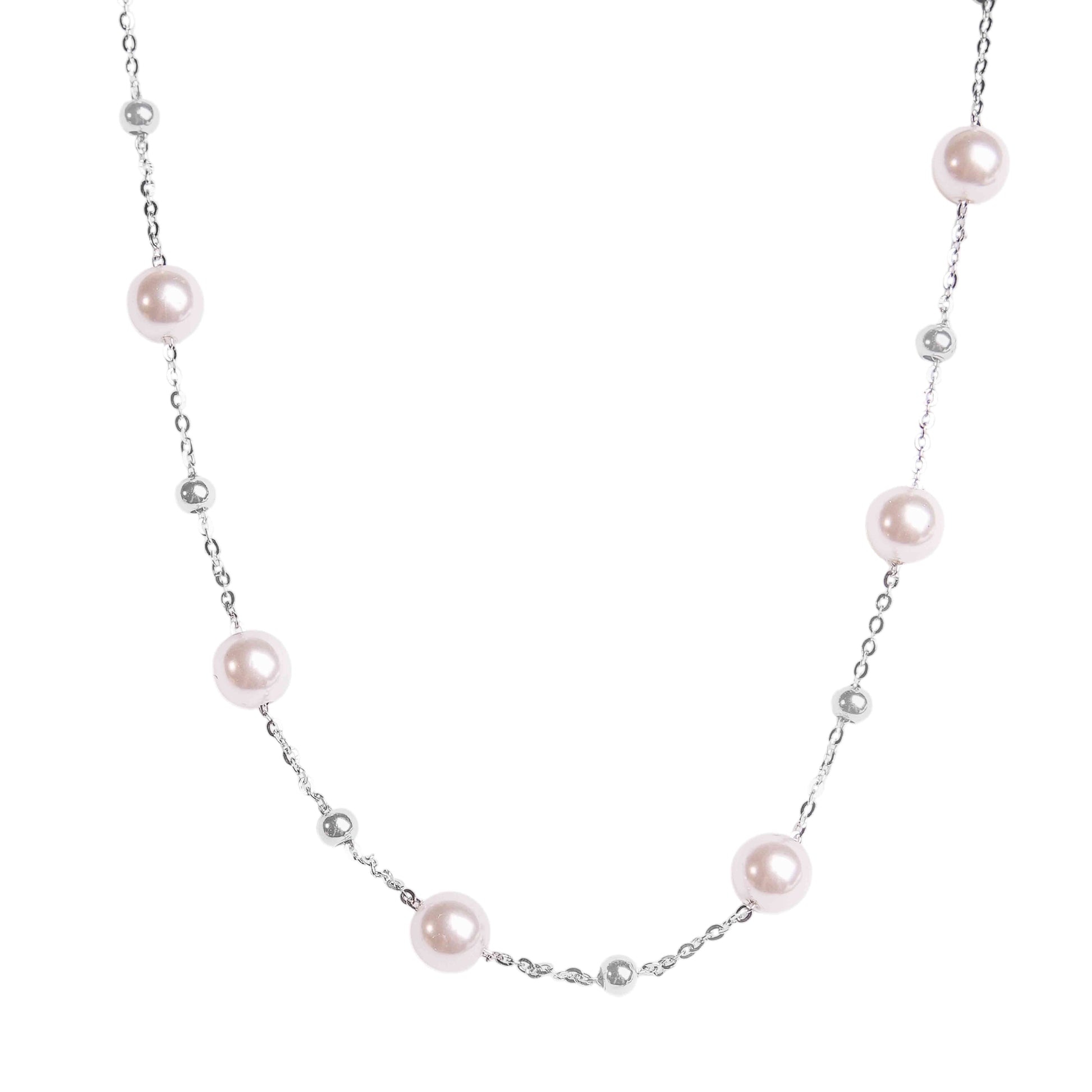 A graceful sterling silver chain with a series of blush-pink pearls and sparkling cubic zirconia stations. This necklace offers a delicate, elegant look with a touch of modern charm.