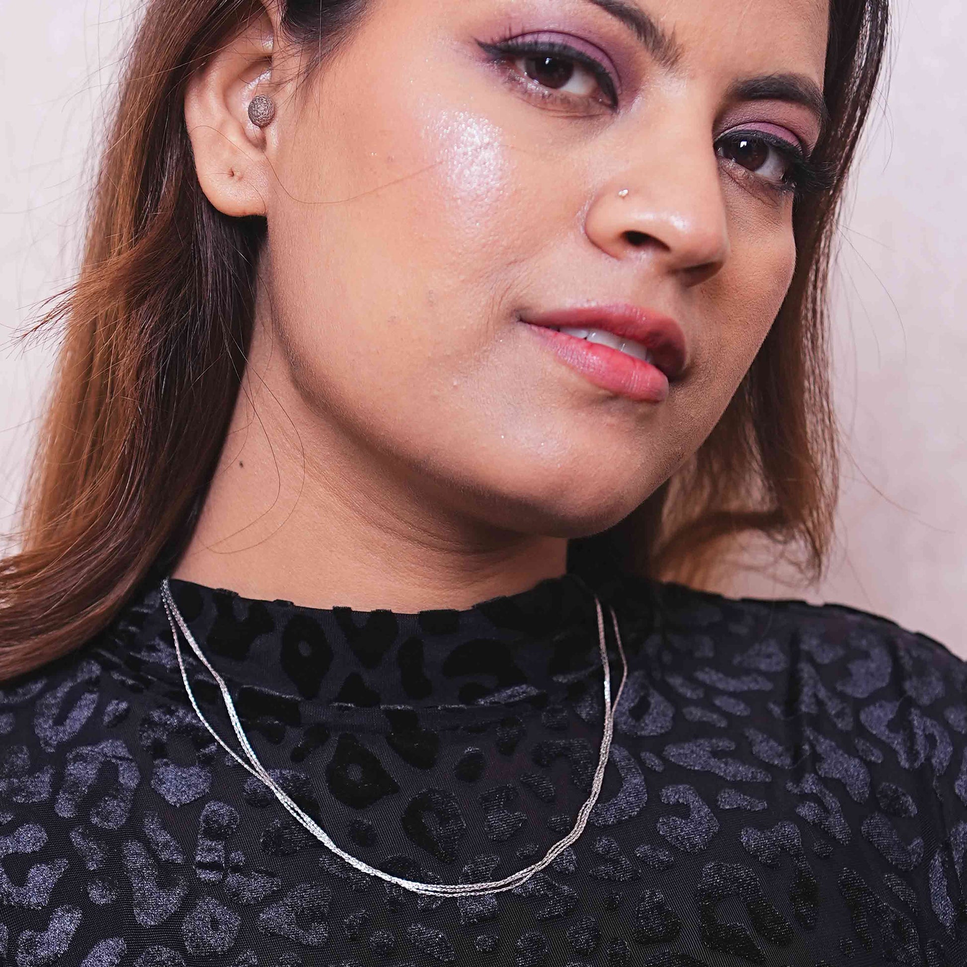 A graceful three-strand sterling silver chain that creates a flowing, layered look. This delicate chain adds a touch of simple elegance and versatility to any outfit.